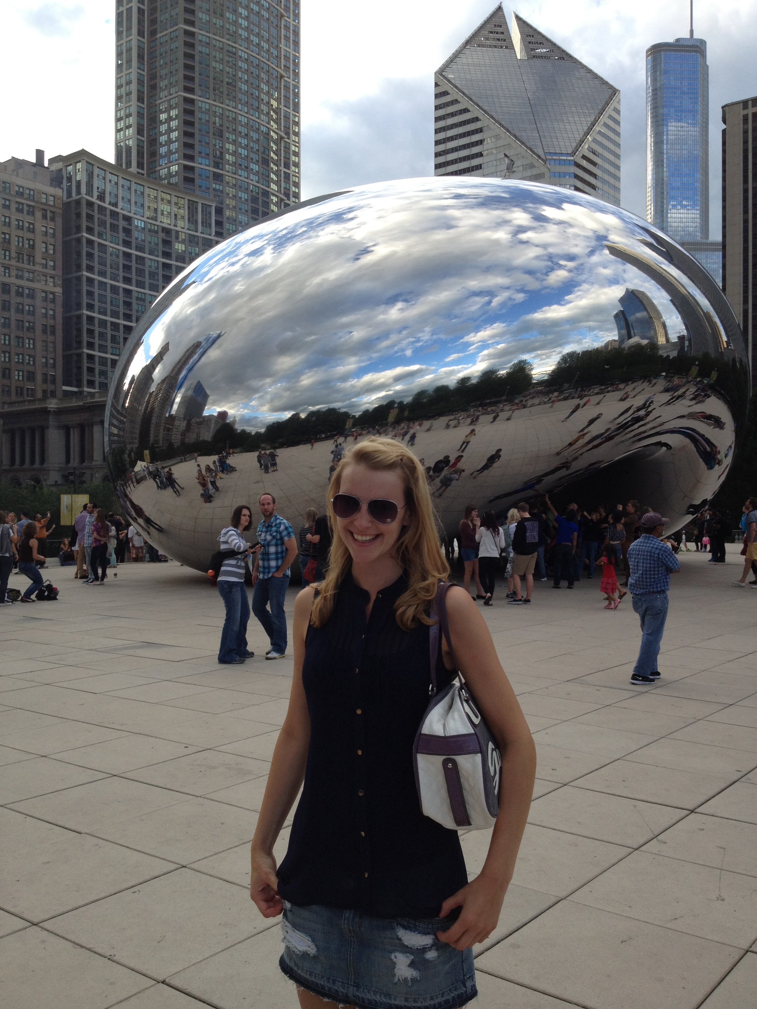 Am Samstag musste ich erneut früh aufstehen, da unser Amtrak (sowas wie die DB in Amerika) nach Chicago schon um 9 Uhr morgens fahren sollte und wir eine Stunde Fahrzeit bis zum Bahnhof hatten. Die Bahnfahrt war ruhig und die 4 Stunden vergingen schnell. In Chicago angekommen verdoppelten wir dann schnell unsere Gruppengröße und checkten, nach einem kurzen Fußmarsch, alle zusammen ins Hotel ein. DAS war mal ein Zimmer nach meinem Geschmack. : ) Aber wir hatten keine Zeit zu verlieren, also schnell frisch machen und dann voller Elan los, die große Stadt entdecken! Chicago ist toll! Die Stadt hat ein ganz besonderes Flair. Das Klima war sehr angenehm und nicht so stickig wie in NY. Die Häuser und Straßen sind vergleichbar mit NY, aber insgesamt ist Chicago nicht so hektisch und unruhig. Ich sag es mal so: Urlaub in NY, wohnen in Chicago. : ) Wir haben unser Sightseeing angefangen, indem wir einmal durch die halbe Stadt gelaufen sind, um eine chicagostyle Pizza bei Lou’s zu essen. Das hat Jill uns wärmstens empfohlen. Die Pizza braucht 30 Minuten bis man sie bekommt und wir waren wirklich am Verhungern, aber es hat sich gelohnt! Die Pizza war einmalig! Chicagostyle bedeutet, dass der Pizzaboden wie ein Kuchen mit Rand gebacken wird. Auf den Boden kommt eine dicke Lage Käse, darauf dann Belag und Tomatensoße. Also für Käsefreaks wie mich ein absoluter Hochgenuss!