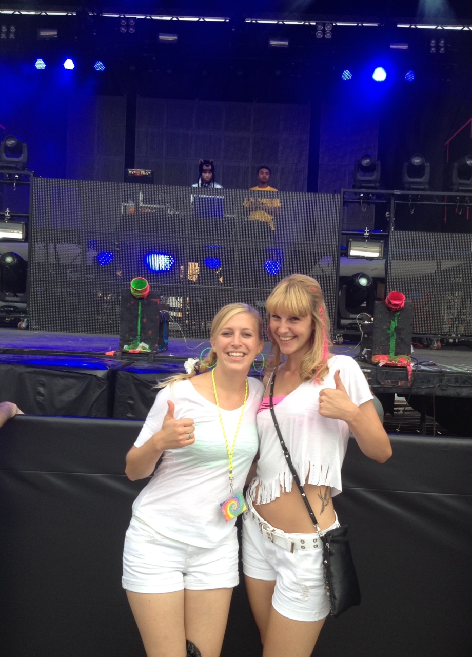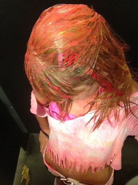 In der letzten Minute des Countdowns kamen dann alle Artisten als Astronauten verkleidet auf die Bühne, die Musik hörte auf und es wurde eine riesen Show gemacht. Einige sind an Seilen in die Luft geflogen und haben sich wild gedreht, einige waren auf den Trampolinen und haben dort Figuren gemacht und einige haben einfach so getanzt. Und dann kamen die letzten 10 Sekunden. Die Securitys hatten auf einmal Regencapes an, Schutzbrillen auf und haben sich unter die Bühne gekauert und ich habe in der letzten Sekunde meine Augen geschlossen und dann kam die große Farbexplosion! Alle Kanonen haben gezündet, die Schläuche waren im Einsatz und ich war (ich erinnere einmal kurz: 1. Reihe) innerhalb von 10 Sekunden völlig farbig. : D So ging das Konzert dann weiter. Zwischendurch wurden die Farbkanonen ab und an unangekündigt gezündet, der Schlauch war häufig im Einsatz und alle haben gefeiert. Und so ging es auch weiter, als der 3. DJ auf der Bühne war. Um 10 Uhr, nach 4 Stunden in der ersten Reihe stehen, gedrückt und geschoben und vollgespritzt werden, habe ich gemerkt, dass mein Kreislauf keine Lust mehr hat. Also hab ich mich von den Security rausziehen lassen und habe mich auf die Tribüne gesetzt. Zum Glück! Dann so hatte ich auch noch einmal einen schönen Blick von oben auf das Geschehen und konnte die letzte Stunde ganz entspannt mit einem Getränk genießen. Vorher konnte ich es aber nicht lassen mal die Toilette zu besuchen und in den Spiegel zu schauen. : D Oh maaaaan. Das war ein Anblick. Alle anderen waren wesentlich farbloser (wahrscheinlich nicht 1. Reihe) und haben sich mit mir gefreut wie ich aussehe. Ein Mädel hat mich angeguckt: „Damn girl, is your normal haircolor blonde?“ und die anderen „Wow, you look AWESOME!“ : D Ich denke das sagt alles.
