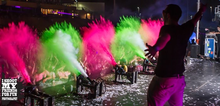 Anschließend sind wir los zur Location, denn dort sollte es von 1:00 bis 4:00 Essen for free geben. Leider waren wir etwas spät dran und erst um 3:45 dort und das Essen war schon alle, also haben wir uns einfach eine Pizzeria in der Nähe des Stadions gesucht und dort in Ruhe etwas gegessen. Danach haben wir uns auf den Weg zum Stadion gemacht und waren schon um 4:30 dort, also 1,5 Stunden vor Einlass. Die Zeit verging wie im Flug, denn die Securitys waren super witzig und haben die ganze Zeit mit uns „Welche Reihe ist lauter“ und anderen Unsinn gespielt. Als wir dann rein konnten, standen wir tatsächlich genau in der Mitte der ersten Reihe. Und die Farbkanonen waren schon aufgebaut. Vorfreude! : ) Dann fing der erste DJ an aufzulegen. Der war schon ziemlich gut, aber es war noch hell und das Stadion füllte sich noch mit Leuten und Farbe gab es auch noch nicht. Also so richtig kam keine Stimmung auf. Das änderte sich schlagartig als der 2. DJ auf die Bühne kam! Der sah nicht nur unglaublich gut aus, sondern hatte es auch echt drauf aufzulegen und Stimmung zu machen! Wow, auf einmal gingen alle so ab, das war enorm. Und die Fotografen kamen kaum mehr hinterher Fotos zu schießen! Und da es auch bei ihm langsam dunkel war konnte man die tollen Lichteffekte sehen und auch die Artisten kamen auf die Bühne und machten zusätzlich Stimmung. Und dann kam auch die erste Farbladung pink aus dem Schlauch. Lustig! Zum Glück ist es in Georgia ja ohnehin so warm, da war es kein Problem die Nacht über nass herumzulaufen. (Außerdem haben wir uns natürlich auch warmgetanzt) Irgendwann wurde ein Countdown eingeblendet, wann die große Farbexplosion stattfinden sollte.