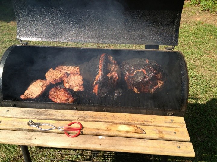 Wieder zu Haus haben wir jeder ein bissl seinen eigenen Kram gemacht bis es losging zu unserem nächsten Ereignis: Ab zu den Eltern von Dustin (Leslies Ehemann) wo es erst ein riesiges Familienessen geben sollte und anschließendes Football gucken. Also schnell in mein neues „Georgia Bulldogs“ Fanshirt geschmissen und ab geht’s! Kaum angekommen wurden wir von Leslie, Dustin und seinem Vater genötigt „Cornhole“ zu spielen. Das geht wie folgt: Es werden 2 Bretten mit ca. 20 Fuß Entfernung genau gegenübereinander aufgestellt. Die Bretter sind ca. nen halben Meter breit und ca. einen Meter lang und haben eine Konstruktion unter sich, dass sie eine gewisse Steigung haben. Hinten (oben) ist ein Loch. Teams bestehen aus 2 Mitgliedern, an jedem Brett steht ein Teammitglied. Jedes Team bekommt 4 Säckchen mit Mais gefüllt. Ziel ist es, als erstes Team genau 21 Punkte zu haben. Punkte bekommt man wie folgt: Man wirft seine Säckchen zum Brett gegenüber. Bliebt ein Säckchen auf dem Brett liegen: 1 Punkt. Trifft man das Loch: 3 Punkte. Man kann die Säckchen vom Gegner runterkicken und deren Punkt dadurch löschen. Hört sich leichter an als es ist, da die Maissäckchen komisch fliegen und man neben seinem Brett stehen muss, also ein wenig seitendrall haben muss wenn man wirft um das gegenüberliegende Brett zu treffen. ABER es hat Spaß gemacht! Anschließend gab es einen riesen Topf Brunswick Stew (bestimmt 10 Gallons, also über 30 Liter), das ist ein typischer Südstaaten-Eintopf, der den ganzen Tag kochen muss. Und ein tolles BBQ. Die Männer haben morgens 2 riesen Stücke Schinken auf den Grill gehauen und den ganzen Tag gedünstet und geräuchert. Selten so gutes Fleisch gegessen! Vollgefuttert haben wir uns im Wohnzimmer auf Sofas und Sessel verteilt, ein paar Oreo Kekse in Footballform gegessen (die haben noch reingepasst) und den „Dawgs“ beim Gewinnen zugeguckt.