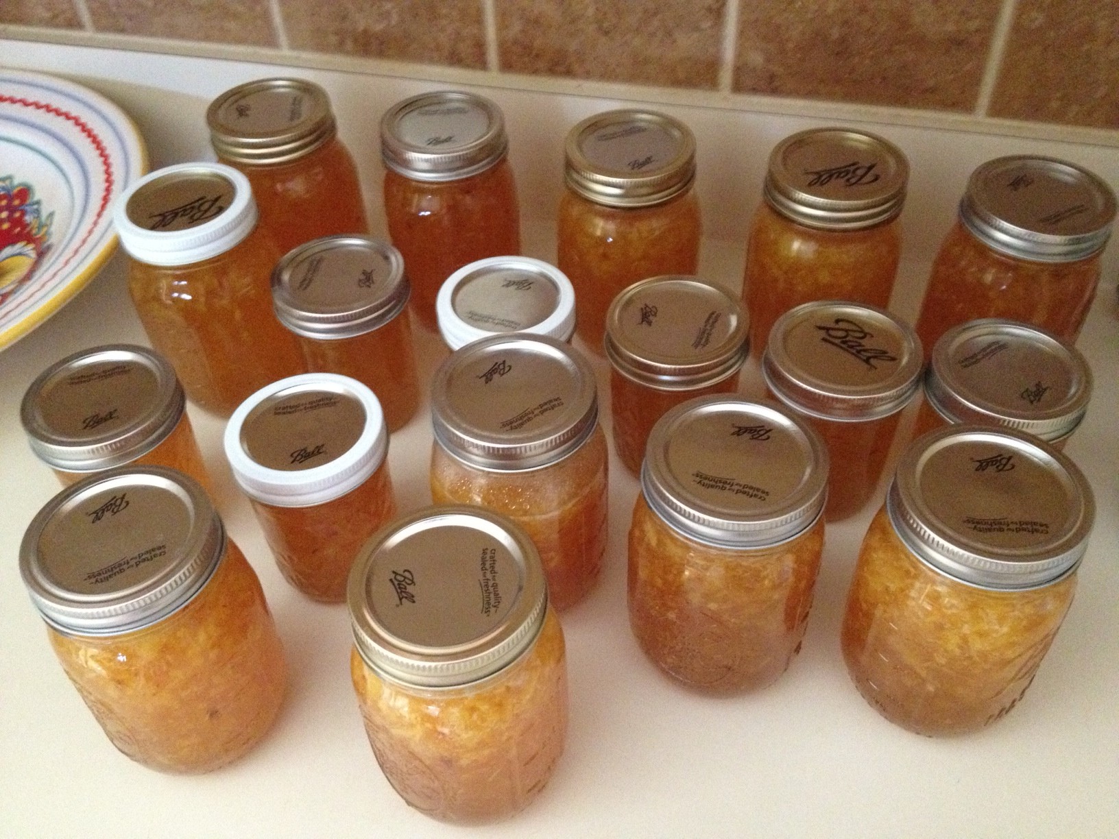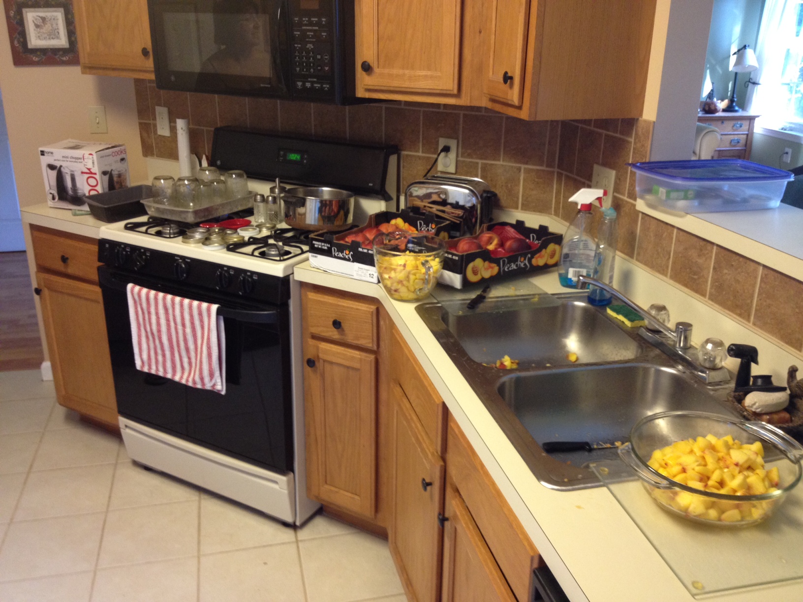 Am Sonntag haben Joann und ich morgens bei wunderbarem Sonnenschein die Hunde ausgeführt. Dann haben wir angefangen die Pfirsiche zu pellen und zu schnippeln und alle Utensilien für’s Marmelade kochen zusammen zu suchen. Leslie kam gegen halb 11 dazu und es ging los: Gläser sterilisieren, Zucker abmessen, Zitronensaft dazu, Früchte pürieren, alles kochen, Jam-Maker dazu, abfüllen, verschließen und die nächste Runde. 3 Runden haben wir so gekocht und insgesamt 11 große und 7 kleine Gläser Jam gemacht. Und ich sag‘ es euch: Die ist sooo köstlich. Beste Marmelade ever! Wer herkommt darf sich dran sattessen. : )